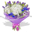 ЛЮКС: хризантема одноголовая белая - 2 шт., хризантема кустовая белая (сантини) - 5 шт., эустома фиолетовая - 4 шт.,  ирисы фиолетовые - 5 шт., статица - 4 шт., фетр фиолетовый.