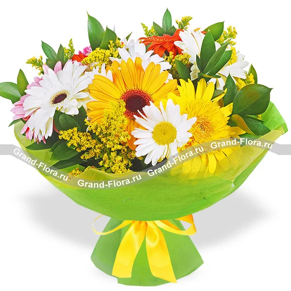 ДЕЛЮКС: ромашка белая - 15 шт, гербера разноцветная (белая, розовая, оранжевая, малиновая, желтая) - 22 шт, солидаго 9 шт, рускус, фетр зеленый.